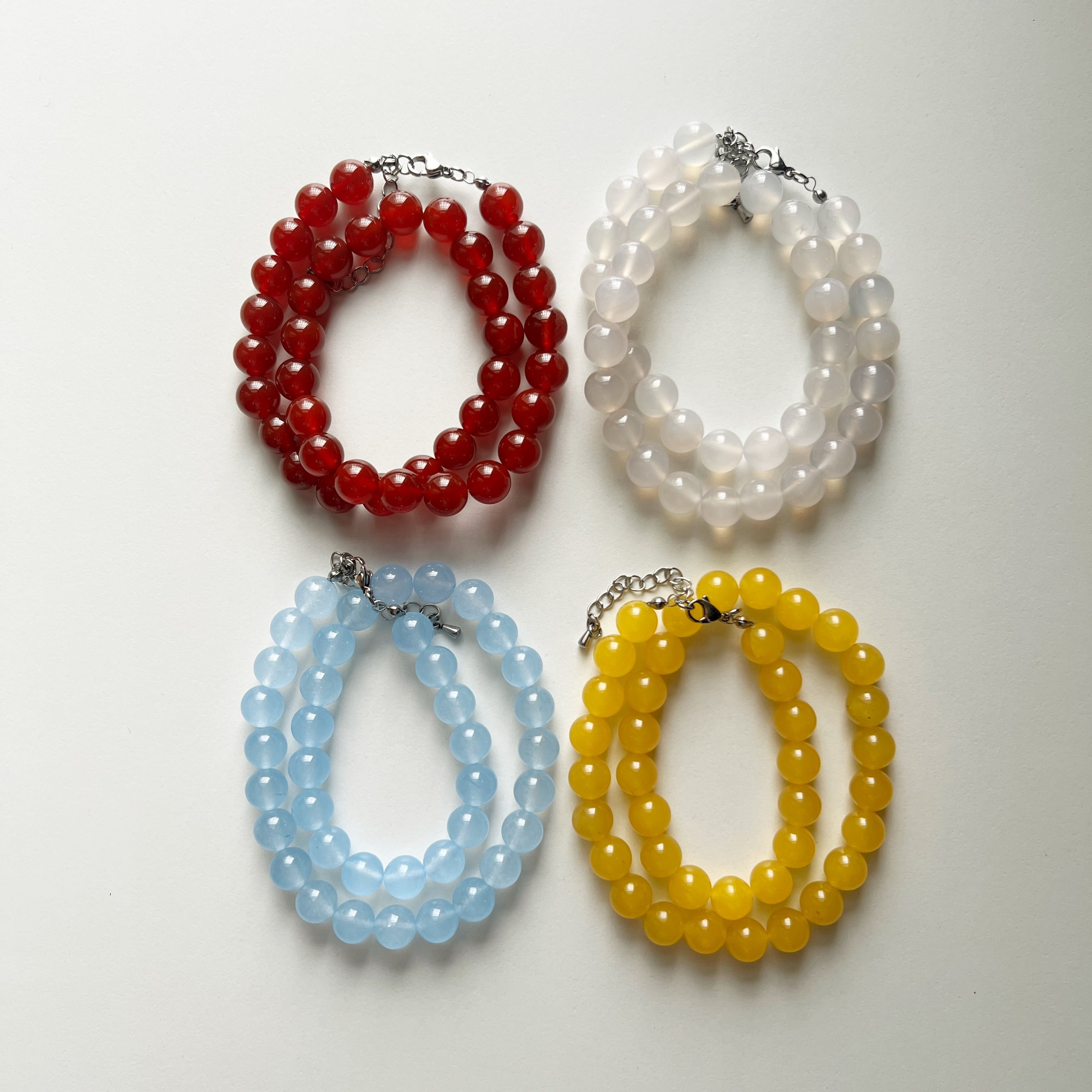 素材:天然石(yellow・blue→染めマレーシアジェイド、white→・ホワイト瑪瑙、red→染めカーネリアン)