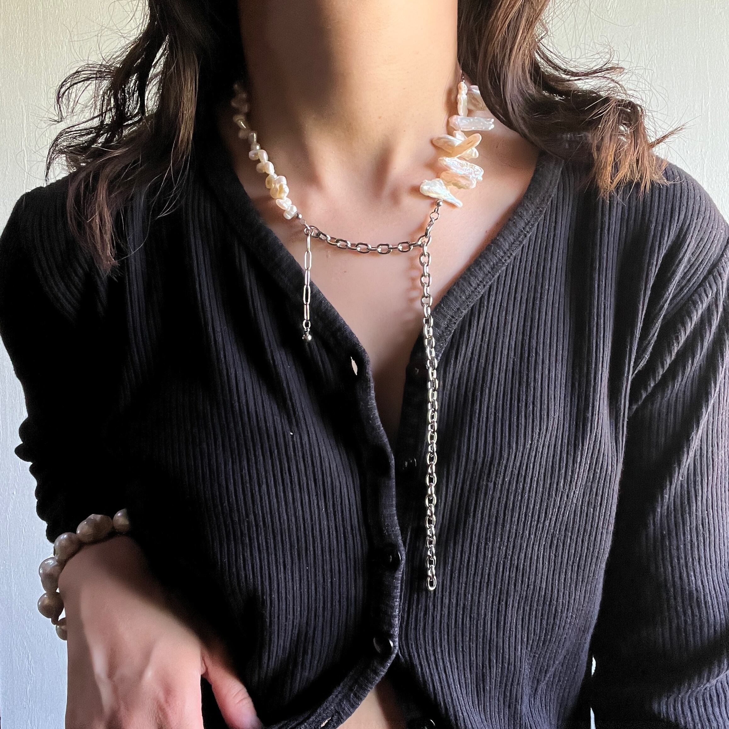 歪な形の淡水パールを散りばめたシルバーチェーンネックレス